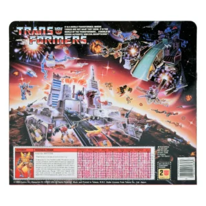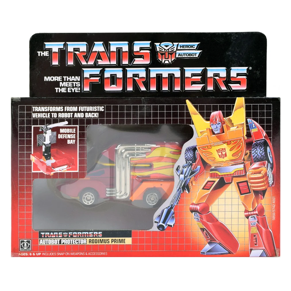 Rodimus Prime was designed in much the same way as Hot Rod, albeit with much less articulation. Rodimus transforms from a robot and Mobile Defense Bay into a futuristic truck. The toy comes with a "Photon eliminator" rifle and two blast shields to attach to either side of his battle platform's cannon. (The yellow spoiler was also to be removed and replaced during transformation.) Like Hot Rod, there are materials variations; initial releases have metal toes and rubber tires, while later shipments replaced both with black plastic. This mold was later redecoed as a lucky draw prize Primus.