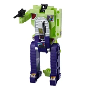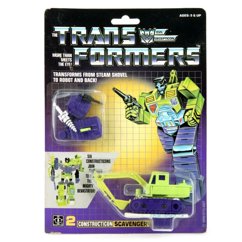 Scavenger was originally from Takara's Pre-Transformers Diaclone toyline, as Construction Vehicle Robot No. 2 Power Shovel. Transforming into a bright green and purple excavator, Scavenger can become an "Attack Shovel" by attaching the "Target Shooter" projectile launcher (with the "Rotor Blade" loaded) onto the pegs on the right side of his green vehicle chassis. He can combine with his fellow Constructicons to form Devastator, functioning as the right arm. His "Target Shooter" becomes Devastator's lower right arm. On the European continent, Scavenger was initially released individually alongside the other Constructicons by Hasbro's subsidiary Milton Bradley (MB) in 1985. In 1986, Scavenger and the other Constructicons were re-released in Europe, albeit this time in "Hasbro"-branded packaging (but manufactured by Joustra). The main difference with all other releases thus far was that the Constructicons' main color was now yellow instead of green. These are not to be confused with the later, non-combining yellow European Constructicons, nor with the yellow Generation 2 Constructicons (see below for both).