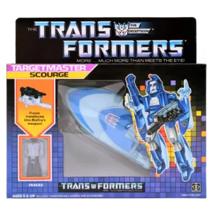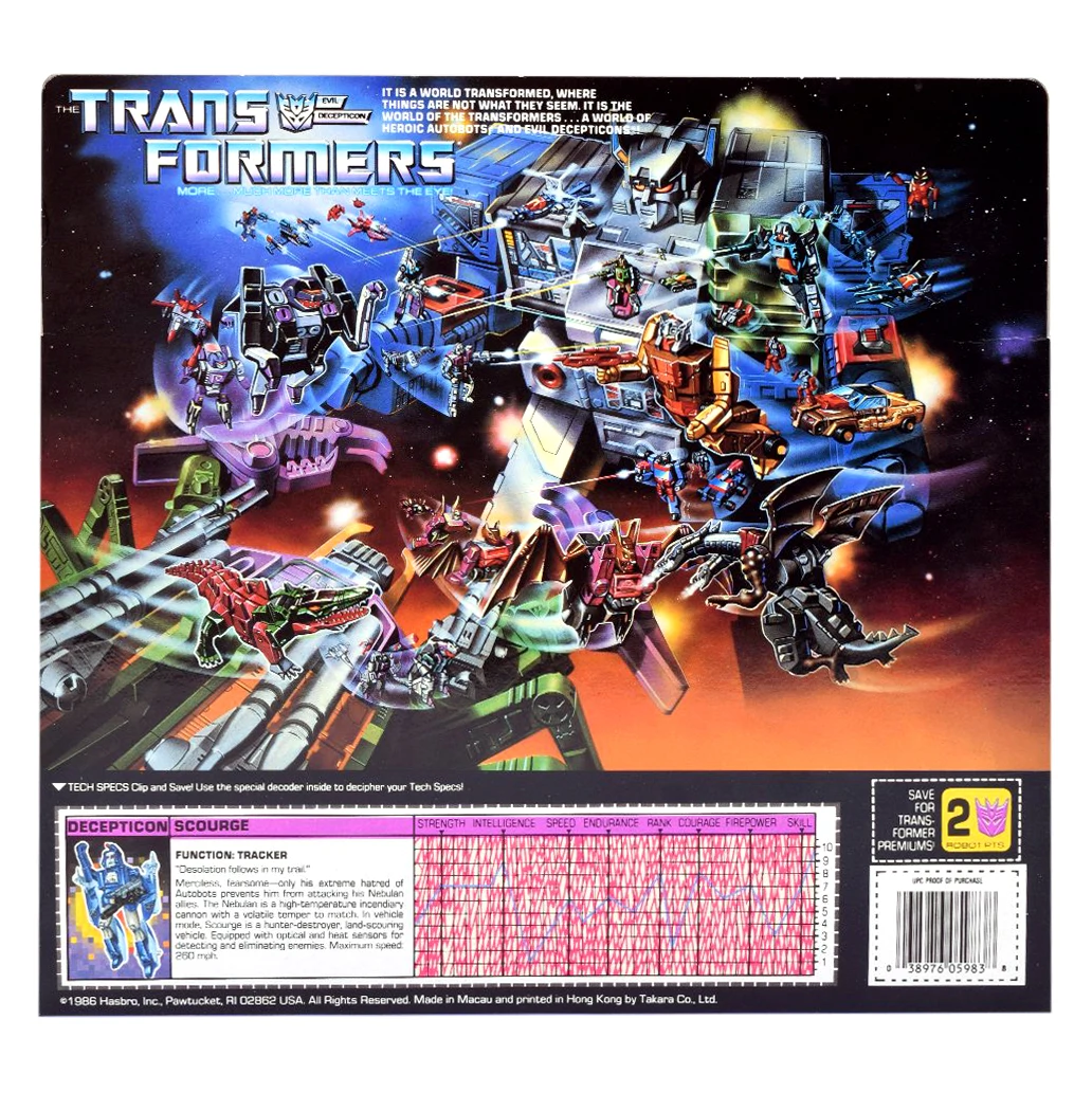 A retool of the original Scourge toy, Targetmaster Scourge's hand-holes were widened, to accommodate a new Targetmaster weapon. His handgun was replaced with Fracas. This retooling made his weapons interchangeable, allowing Scourge to wear Fracas on his head and to hold his "Rocket Booster" (the new name for the "Disintegrator ray") in his hand. Yay, progress! Still don't know why he's got knees, though. Targetmaster Scourge's packaging originally contained the erroneous blurb "Fracas transforms into Misfire's weapon!" Supposedly, this was fixed by a running change, but the corrected version is said to be much rarer than the fixed box for Targetmaster Hot Rod, who originally suffered the same problem. Like Targetmaster Cyclonus & unlike most of the 1987 Decepticon Targetmasters, This version of the toy was not released in Japan.
