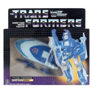 Scourge has a beard and a mustache and transforms into a Cybertronic hovercraft. On early releases, the blue on the center of Scourge's alt mode was paint. This was changed to two stickers for later releases. The stickers on his ankles tend to get damaged through normal transformation. Scourge's design has some oddities to it other than just him being a beardo. His head mounted gun (the "Disintegrator Ray") is on a standardised 5mm post hole, but his fist holes are smaller — so his Laser Blaster and Disintegrator ray aren't interchangeable. Scourge also has knees. He's got no reason to have knees, they're not part of his transformation or really useful for anything, but he still has them. Maybe he could use them for flying poses in robot mode. Maybe. Some releases of Scourge came with a piece of a four-part The Transformers: The Movie poster with glow-in-the-dark elements.