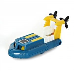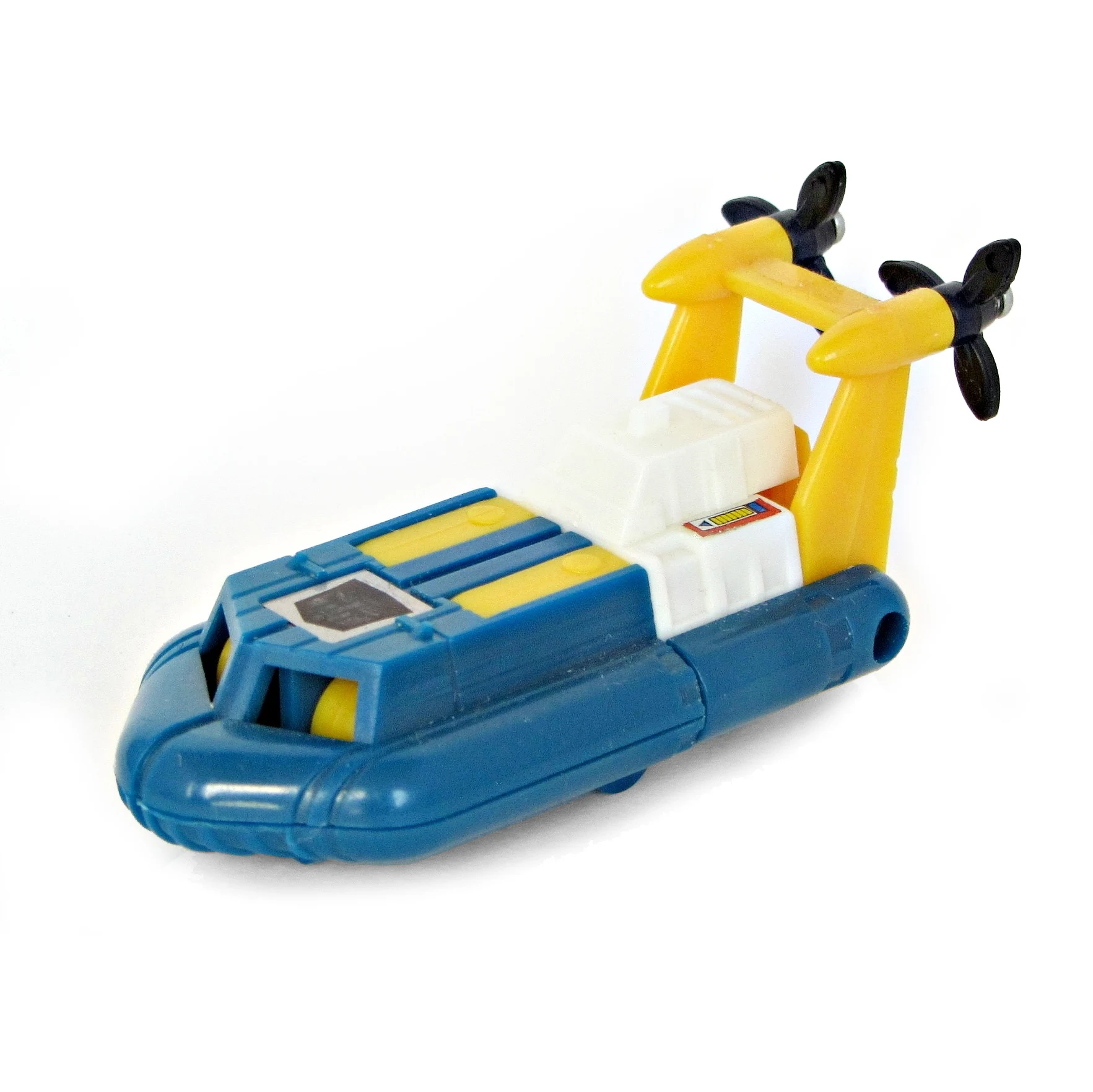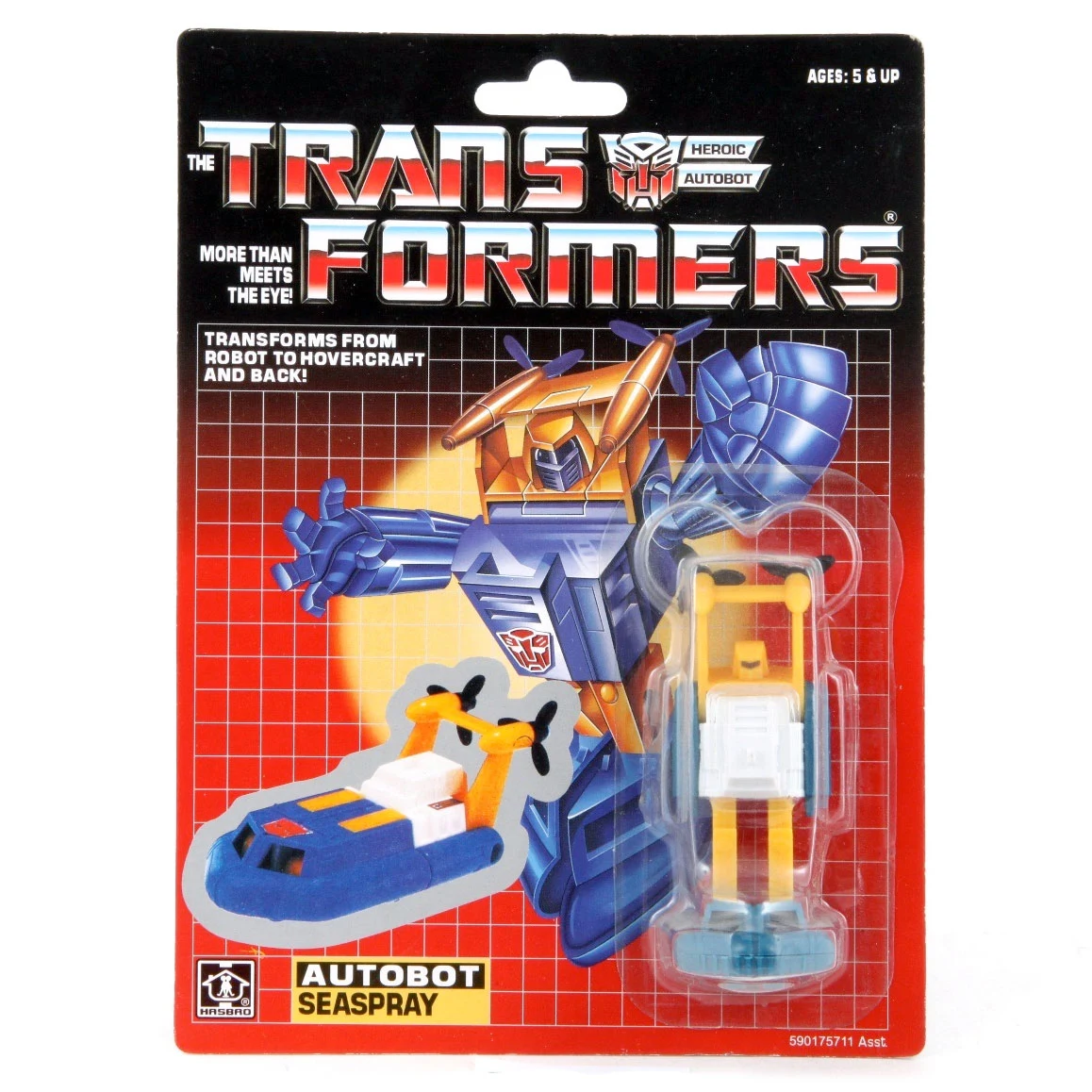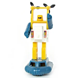 Seaspray's Generation 1 figure stands three inches tall and is one of the smaller figures of the line. The figure has a simple color scheme consisting of blue arms and feet, a white chest, and yellow legs as well as head and propeller system. The figure's only real articulation is at the shoulders. Like all the Mini Vehicles, Seaspray is available in a variety of pack-in variations. He was available with or without a Mini-spy figure. The mold has the Takara and/or Hasbro copyright stamp on the bottom of the feet portion. Seaspray converts into a hovercraft with two propellers.