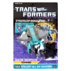 Seawing transforms into a robotic manta ray... with legs. His two "Venom Lasers" can be mounted on the undersides of his "wings". A Targetmaster,[1] he has a third dual proton blaster mode that can be mounted on the weapon stand formed from the "Tripod Rifle" and other accessories, or held in the hand of the Seacons' combined robot. As a Scramble City-style combiner, he can form an arm or leg to any compatible robot combination, though his nominal placement is as the left arm to Piranacon. Seawing is cast from teal, gray, and black plastic, with golden yellow paint on his manta ray-mode eyes and robot-mode face being the only paint applications on the figure. Seawing shares his color scheme with Nautilator, while lacking some of the more garish colors of his other teammates. This toy was sold in Japan as Kraken. It was also used to make Beast Wars II Terrormander.