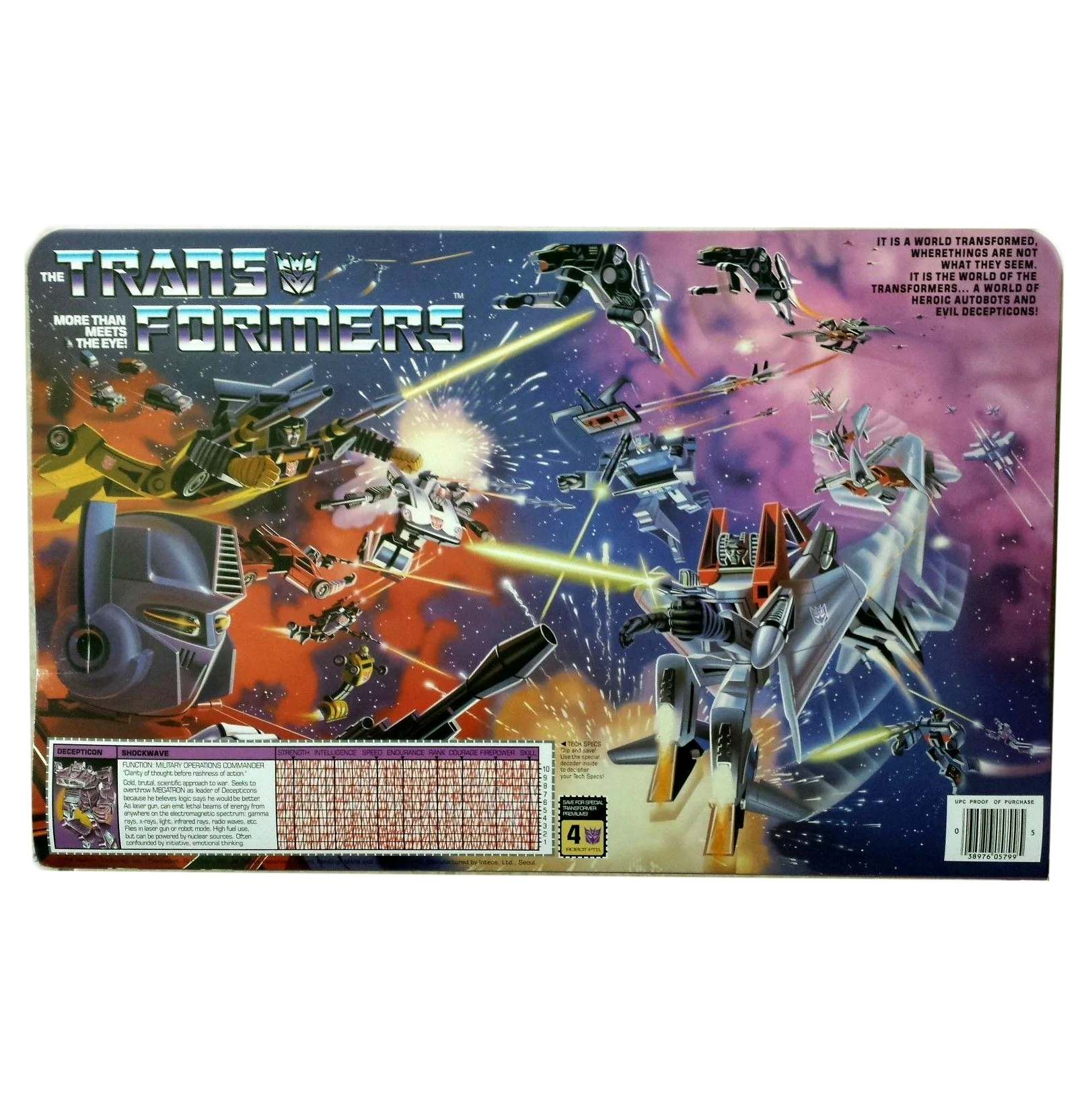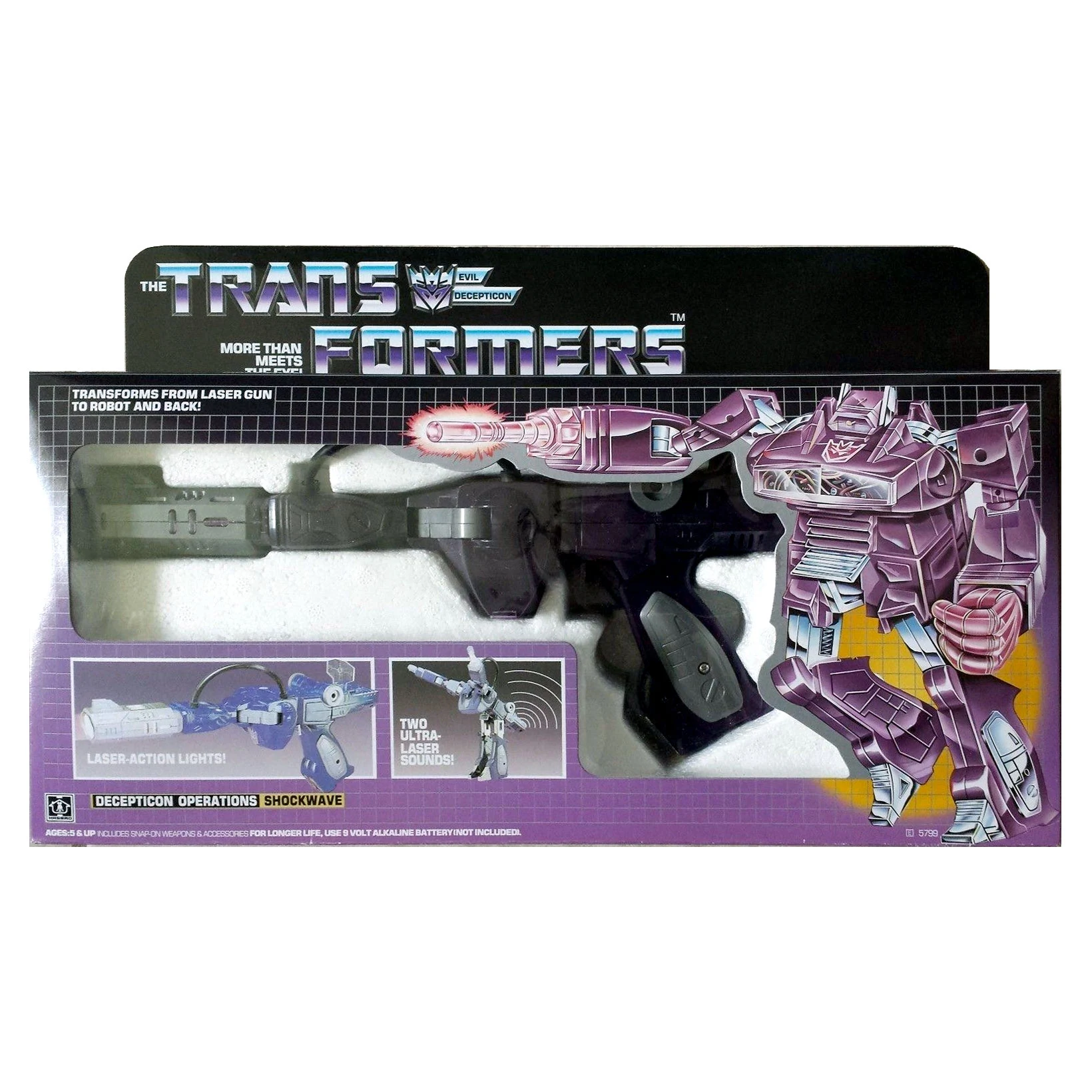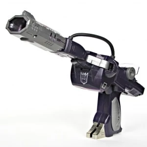Sold boxed, Shockwave was one of the very first 1985 toys to see release, if not the first. Shockwave transforms into a large Cybertronian handgun, and features light and sound electronics powered by a 9-volt battery. Pulling his trigger activates a flashing light in his gun arm and one of two (fairly generic) blaster-sound frequencies, which are toggled between by a small switch on his backpack; in gun mode, the light winds up in his barrel. As a robot, he has a large, if not the most, amount of articulation for the era. Officially, his die-cast feet are rotated into his legs in gun mode, but if you wish to display him free-standing, leaving the feet out (as shown in the picture to the right) balances the figure and keeps him from tipping forward from the weight of his arms and barrel. Shockwave was initially sold without a rub sign; one was later added to the side of his torso. The rubber hose covering the wires connecting his torso and arm's electronics is particularly prone to dry-rotting. Be careful! The Shockwave mold was licensed from the Korean toy company ToyCo.