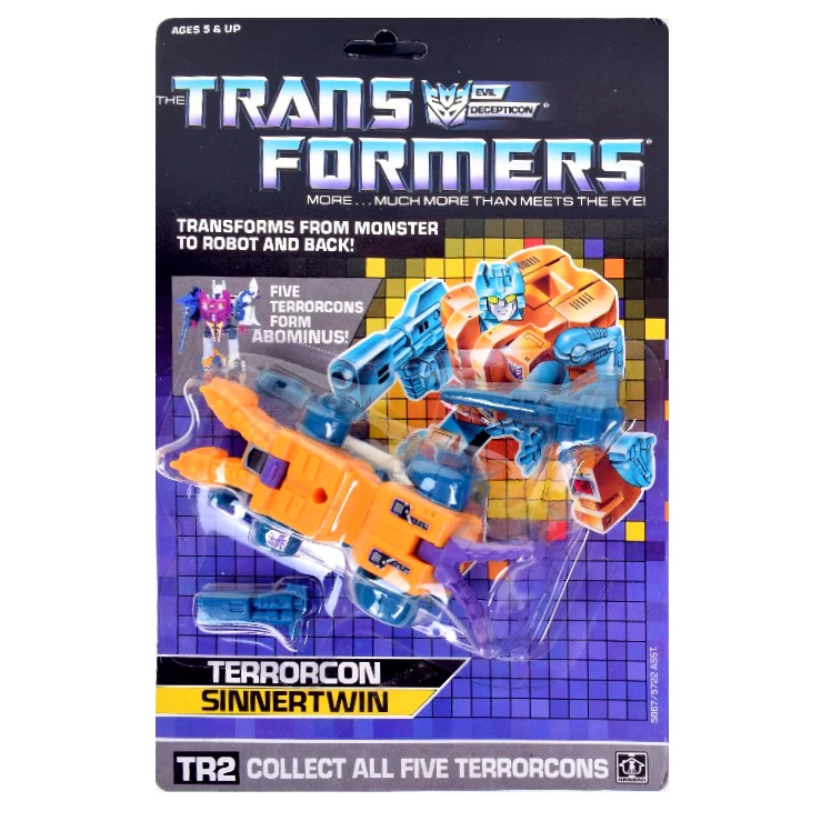 Sinnertwin transforms into a yellow and green two-headed dragon. He comes with a small pistol for robot mode and a large gun for beast mode. He can form the leg or arm of any Scramble-City type combiner, though he is nominally Abominus's left leg. He can also attach to Metroplex's robot mode. His large gun can be held by Abominus. Due to a design flaw, the gap in the chest where the head swings down is just too narrow, and because of this, the head breaks off at the hinge very easily. As such, it is highly inadvisable to use Sinnertwin as Abominus' arm. There is a variant of Sinnertwin which does not have the rubsign indent.