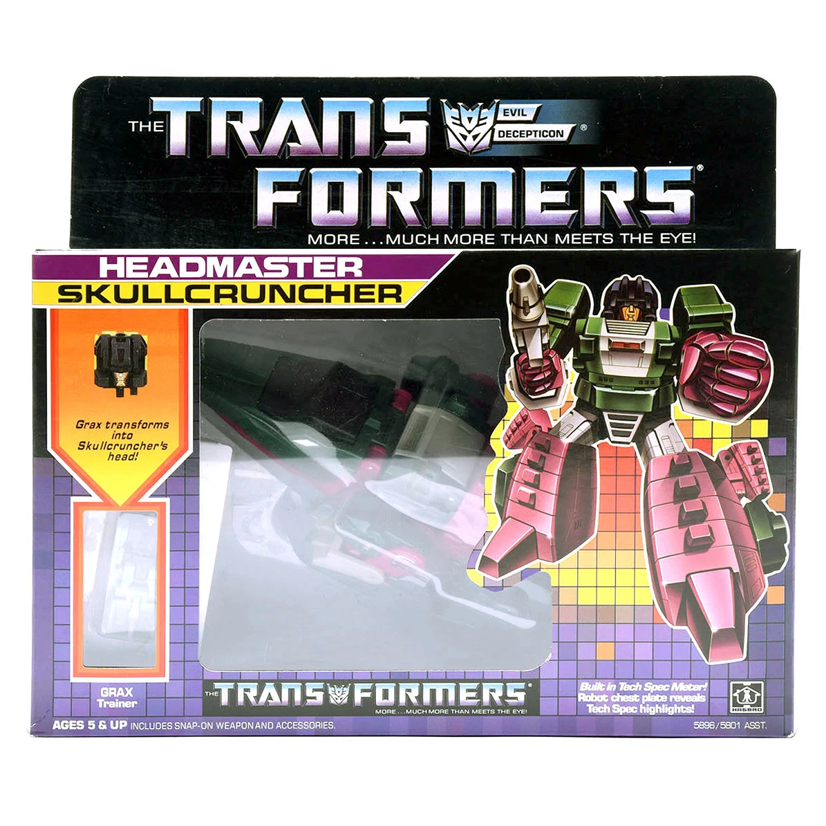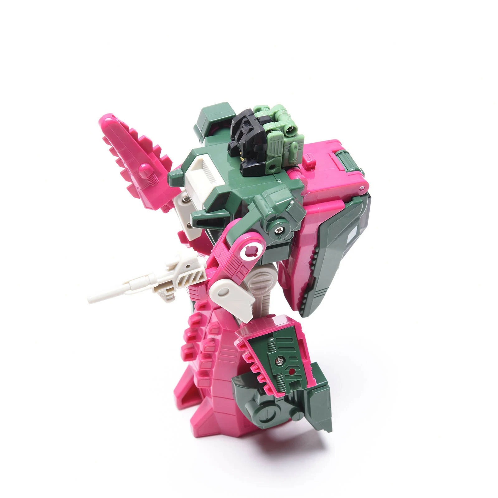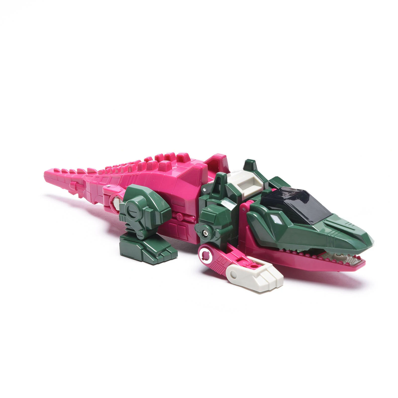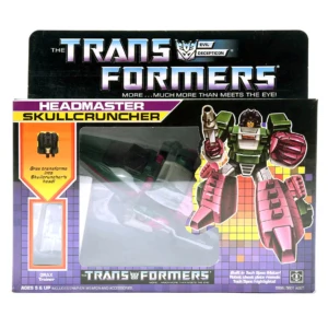 Skullcruncher transforms into a green and pink robotic crocodile, at least according to his packaging; his head implies he's actually an alligator. Skullcruncher includes one of the most bizarre alt mode cockpits among the Headmasters for his partner Grax, a small molded seat at the back of his alt mode mouth below the large canopy that serves as this mode's eyes, his entire upper jaw serving as the hatch to access it. The sword/tail's shape actually makes it look more like a short club. In robot mode, his chest panel flips down to reveal a three-stat spring-loaded Tech Spec meter activated when a Headmaster is plugged into his neck. This gimmick works with any other Headmaster "pilot" figure, and will display different levels dependent on which Headmaster figure is plugged in.