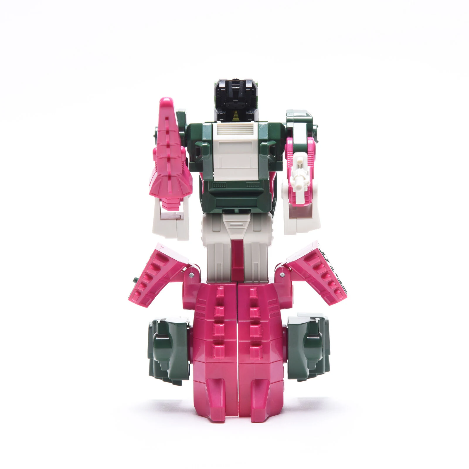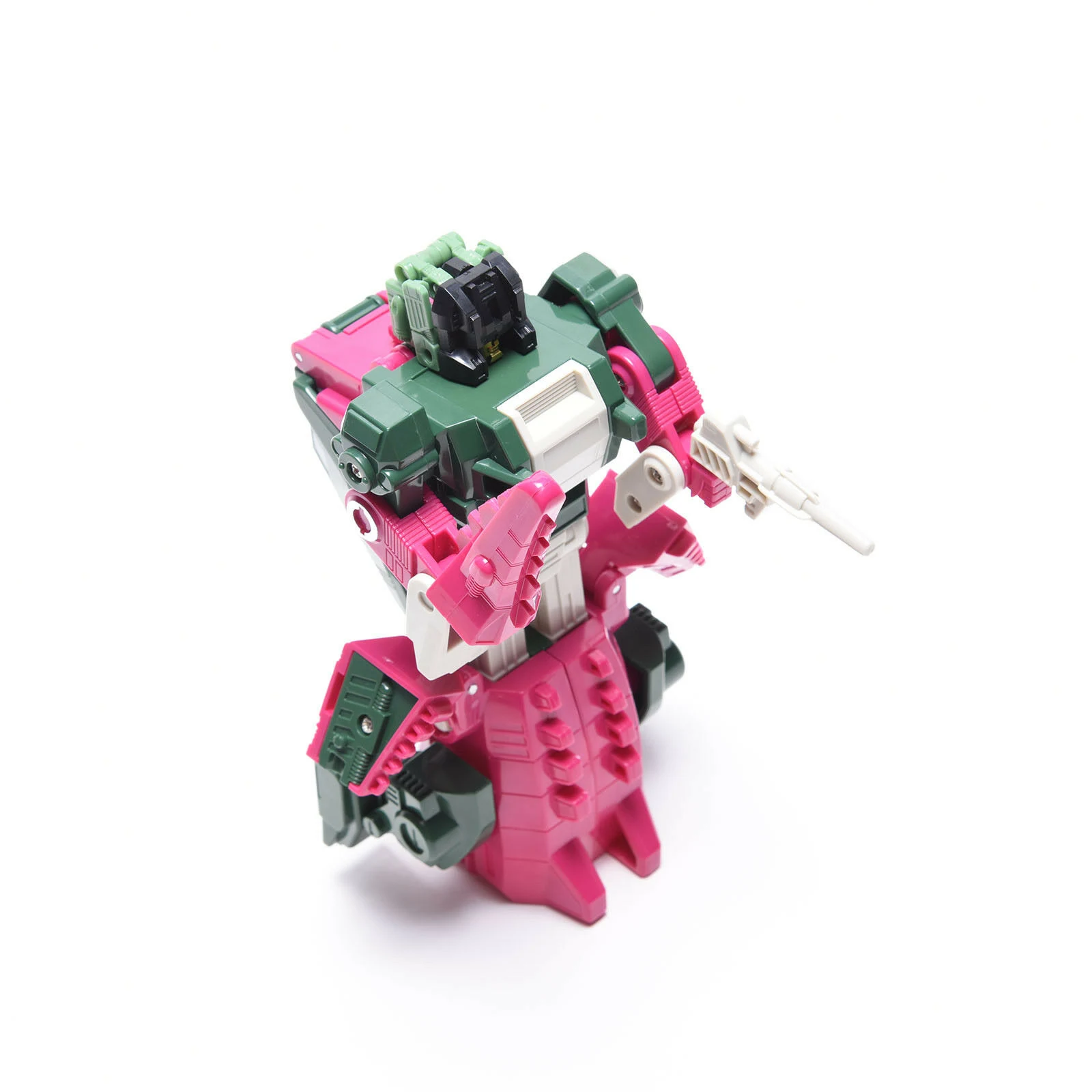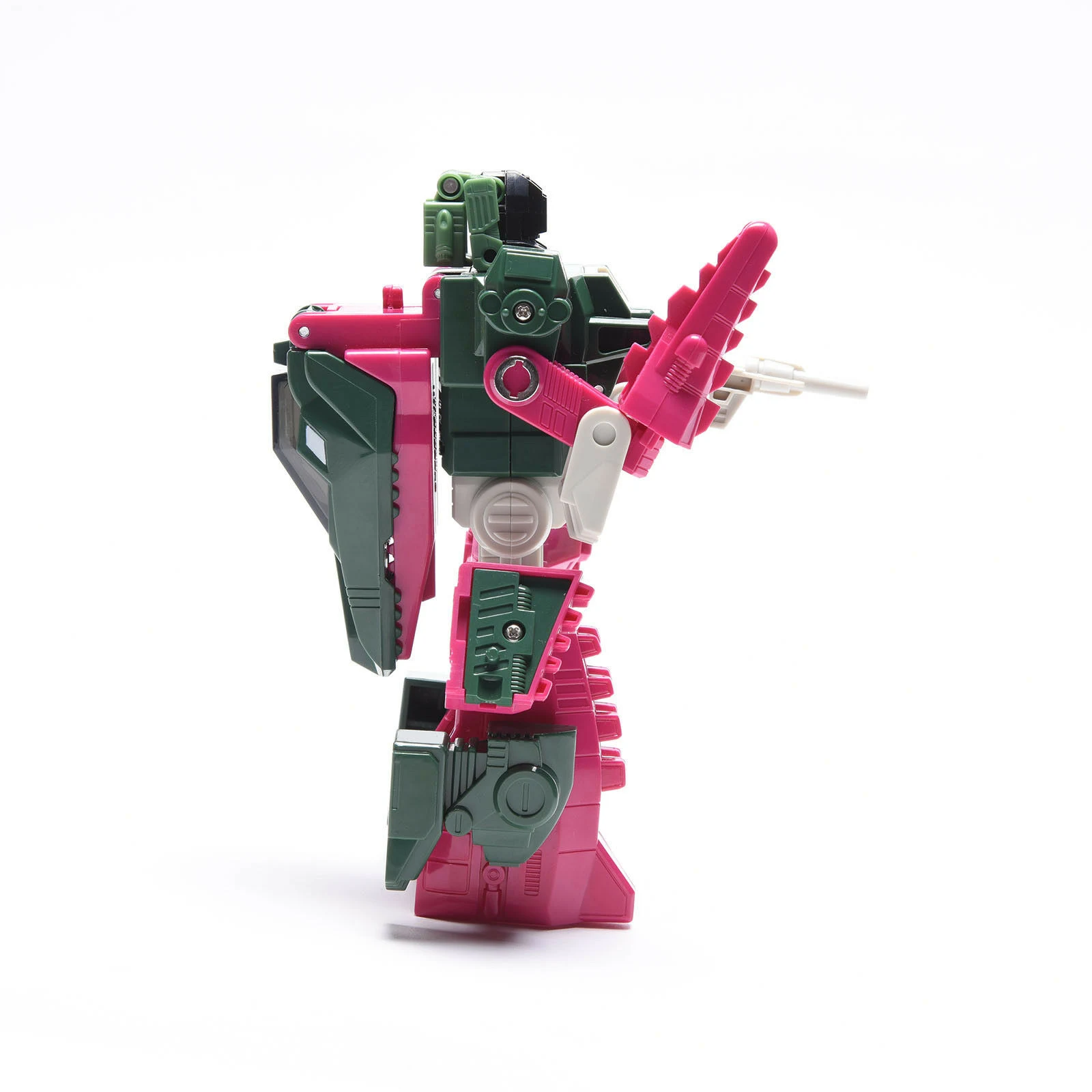 Skullcruncher transforms into a green and pink robotic crocodile, at least according to his packaging; his head implies he's actually an alligator. Skullcruncher includes one of the most bizarre alt mode cockpits among the Headmasters for his partner Grax, a small molded seat at the back of his alt mode mouth below the large canopy that serves as this mode's eyes, his entire upper jaw serving as the hatch to access it. The sword/tail's shape actually makes it look more like a short club. In robot mode, his chest panel flips down to reveal a three-stat spring-loaded Tech Spec meter activated when a Headmaster is plugged into his neck. This gimmick works with any other Headmaster "pilot" figure, and will display different levels dependent on which Headmaster figure is plugged in.