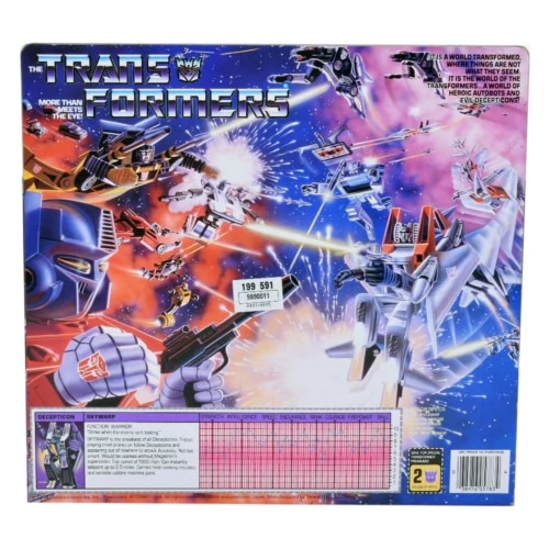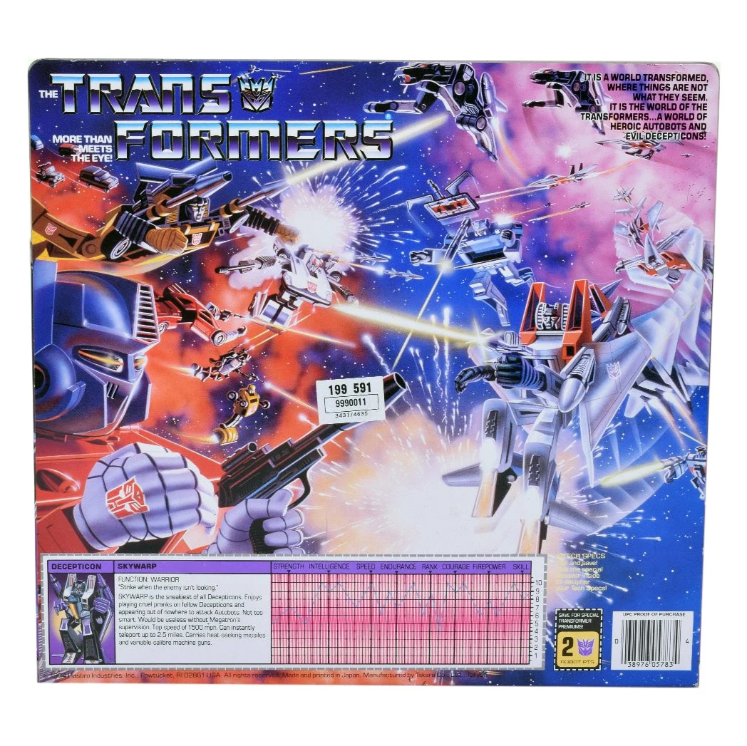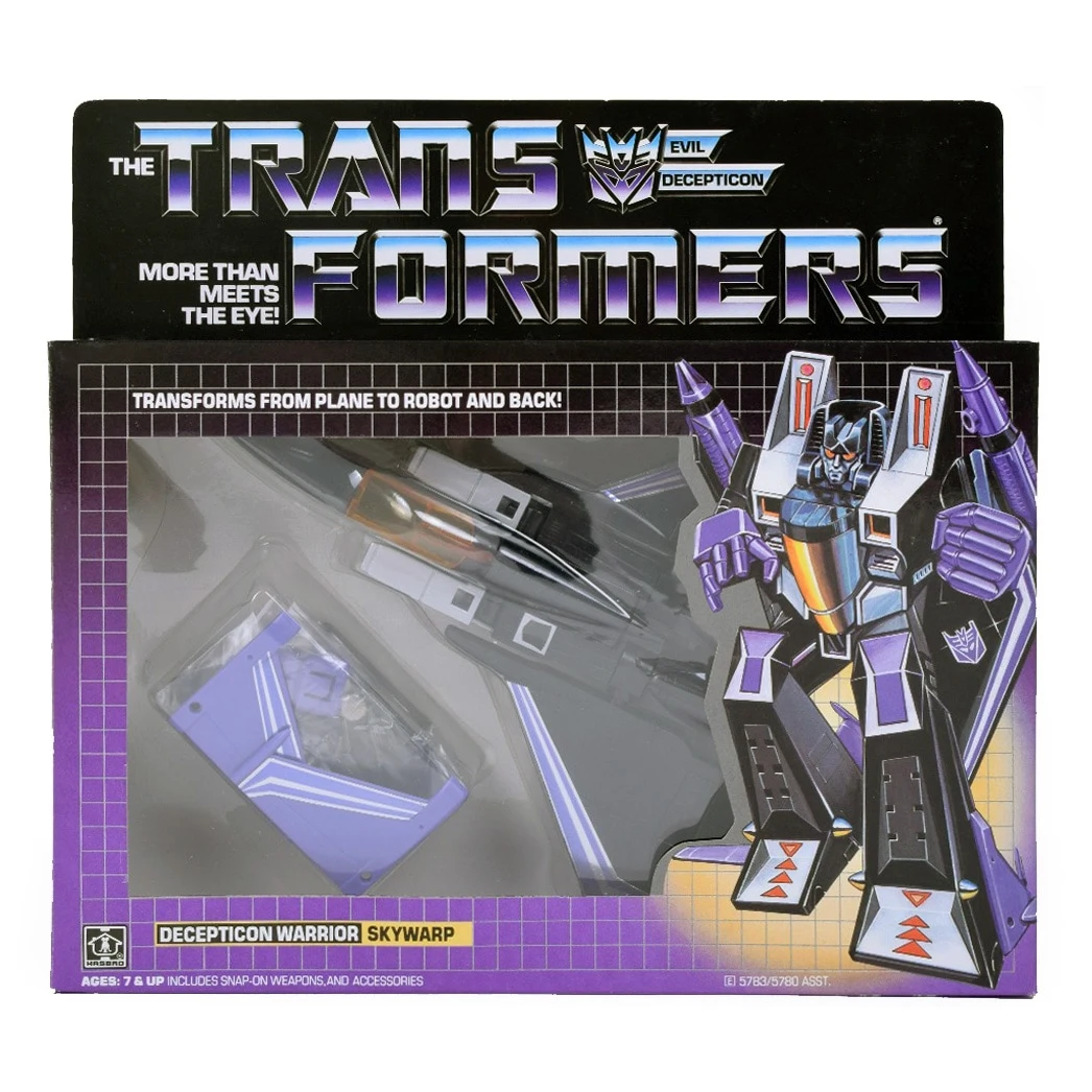 Skywarp began life as a Diaclone "Jet Robo", but unlike team-mates Starscream and Thundercracker, which whom he shares his mold, his distinctive black-and-purple deco did not originate in that line. Skywarp transforms into an F-15 Eagle fighter jet, by a process which essentially involves removing and reattaching most of his plane parts. Though it is possible to do so without removing all of them, this rather piecemeal design and the fact that neither mode uses all his parts means it can be quite difficult to find an intact original Skywarp on the secondary market. Skywarp is armed with a pair of missile launchers that mount on his arms in robot mode, and under his wings in jet mode, with a pair of specialized projectiles for each. In jet mode, two short rockets are fitted into the launchers to make them resemble the drop tanks a real F-15 carries, while in robot mode, they are replaced with the long barrels of Skywarp's machine guns. The original Diaclone version of the mold featured spring-loaded firing mechanisms in these launchers; while this feature was removed for the Hasbro release of the toy, it was left intact for the Takara version, and all subsequent reissues. While the earliest releases of Skywarp were basically identical to the Diaclone mold, some small modifications were soon made to the figure which became the standard for all subsequent reissues of the mold. These included the hollowing out of the inner edges of his wings and the tips of his tail-wings, the lengthening of the pegs on his wings, and the addition of extra clips on the inner sides of his fist-gauntlets, allowing them to grip his arms better but creating a visible slit on them. Like all his 1984 brethren, Skywarp gained a factory-applied rubsign in 1985, which was added to the left side of his fuselage. For some reason, the stats on Skywarp's, Starscream's and Thundercracker's Tech Specs were switched around. Skywarp's box was given Starscream's numbers, giving him a high intelligence and rank that stood in contrast to the bio printed next to them. Early Hasbro stock photos of Skywarp (left) show him with a plastic purple nosecone. This was changed to a soft, black rubber nosecone when the toy was actually released. However, a Mexican variant retained the purple plastic nosecone. The same stock photos also show him with purple launchers with black triggers and muzzle rings, black feet, black shins, black outer arm panels, purple horizontal stabilizers, and both sets of purple missiles. These stock photos were also later used to promote Takara's 2001 reissue (see below). This mold was redecoed into Sunstorm and retooled to make Dirge, Ramjet, and Thrust.