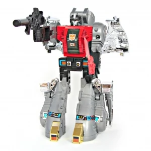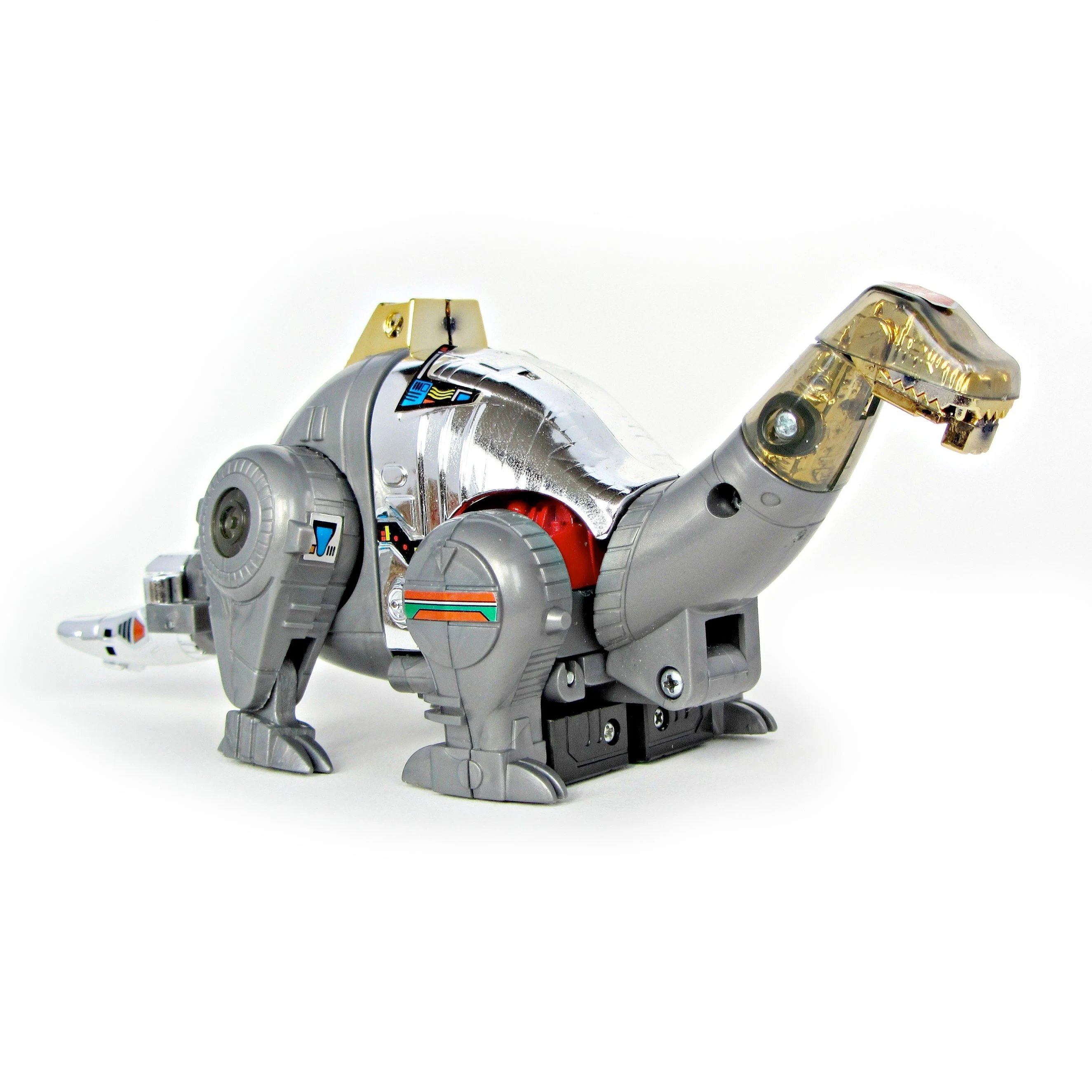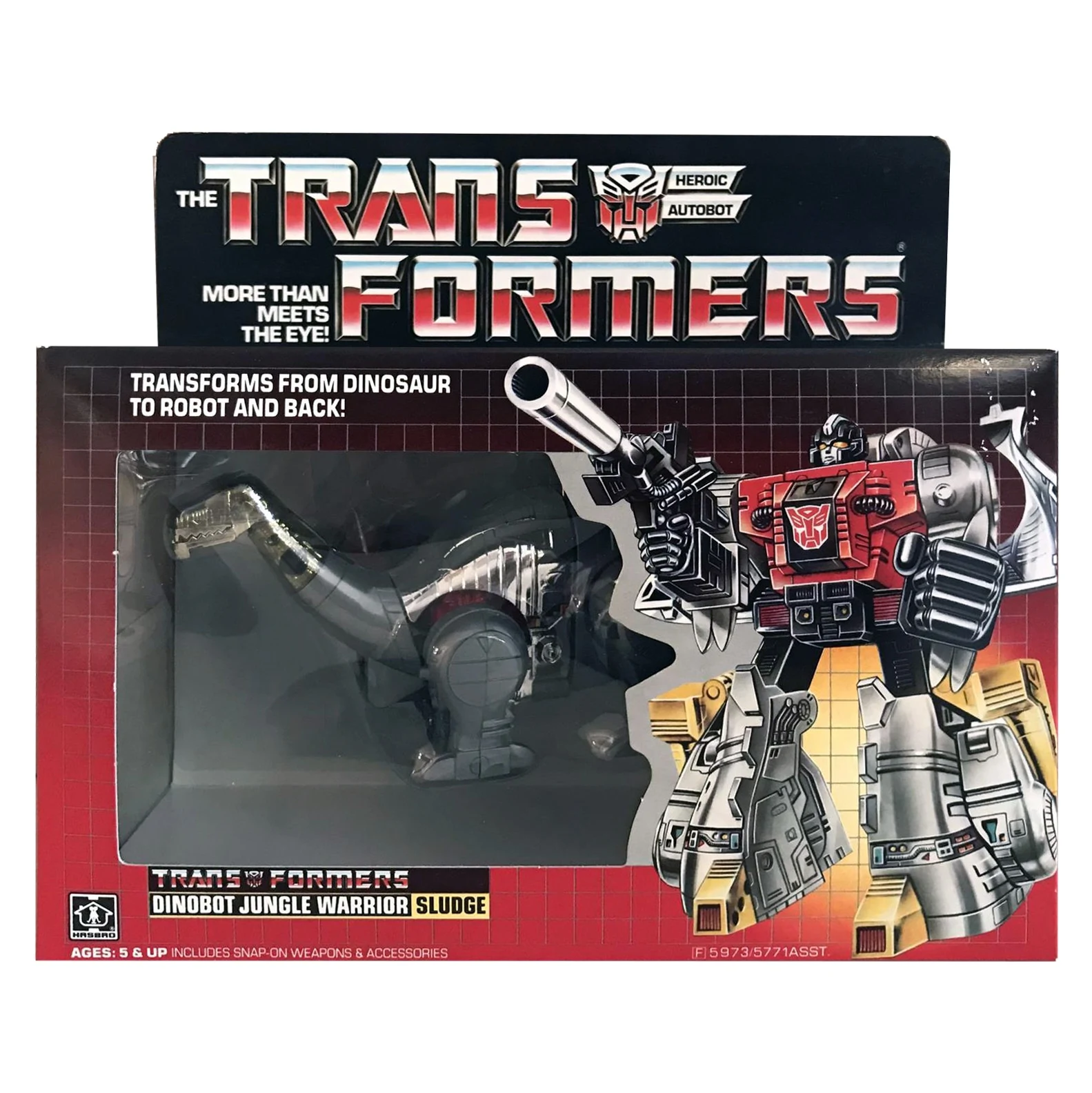 Sludge was released as part of the second series of Transformers in 1985, transforming into a robotic Brontosaurus. He has a trio of silver rockets, a rocket launcher, a black gun, and a red sword. Like most Diaclone-era molds, Sludge also has a conspicuous driver compartment located in his chest. Sludge was re-released in the European "Classics" line in 1991. In Japan, he and the other Dinobots were offered as mail-away items during Operation Combination; Sludge cost 2300 yen (his original retail price) and two Robot Points. In stark contrast to most Transformers toys of his era, Sludge is fairly well articulated in robot mode. He has a waist swivel, his legs move in and out at the hips as well as back and forth, and he has articulated knees. He also has articulated elbows and wrists, although they can only bend inward. Still, impressive for his time. He can totally facepalm.
