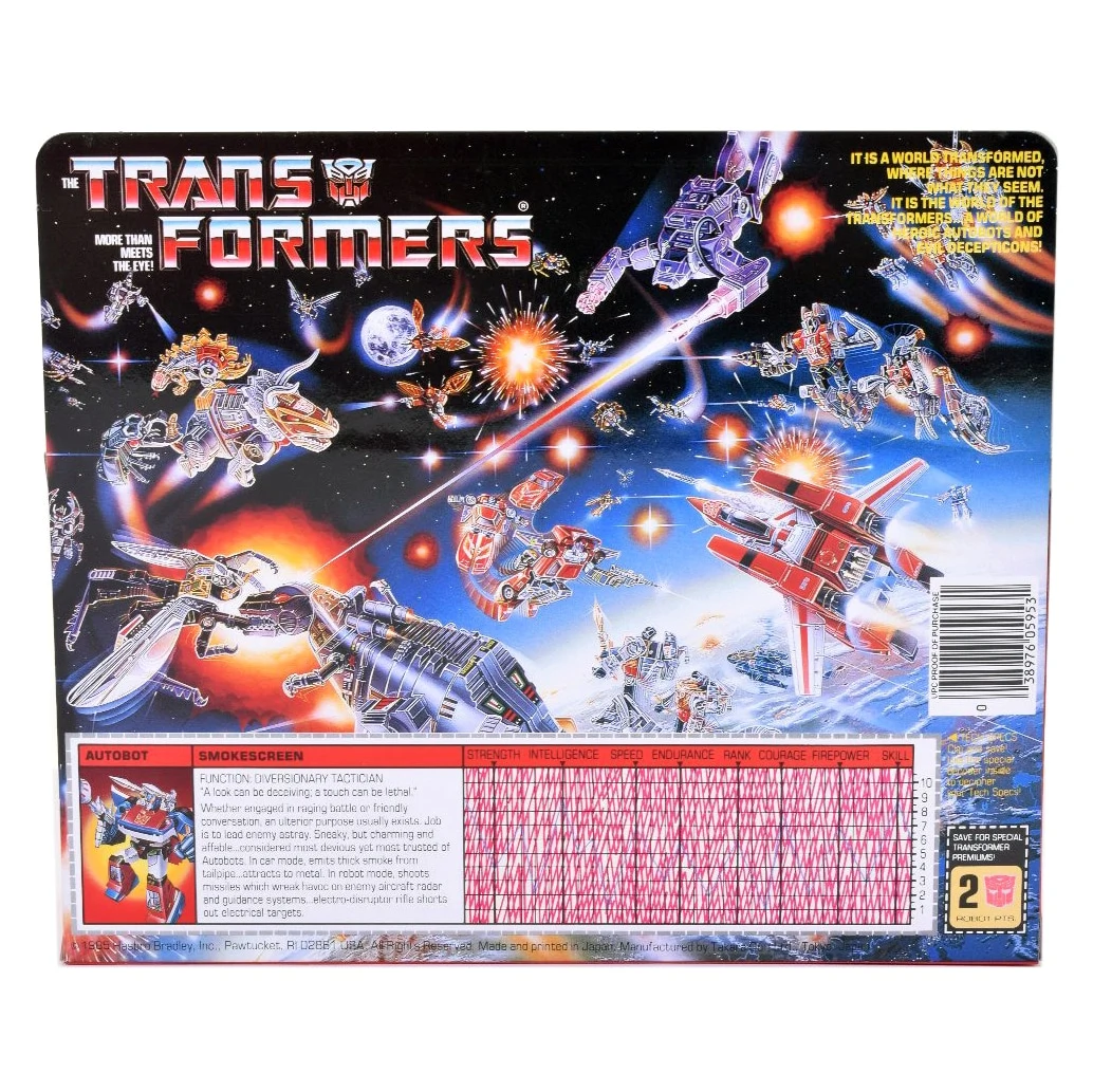 Generation 1 Smokescreen transforms into a Datsun 280ZX Turbo based upon the Electramotive Davendorf/Sharpe touring car. Though Smokescreen is a Datsun 280ZX, he is a redeco/retool of the standard body used by both Bluestreak and Prowl, featuring a much larger front fender and a rear spoiler. He is predominantly blue, red and white in both vehicle and robot modes. Like Bluestreak and Prowl, he features two spring-loaded missile launchers mounted either side of his head, and is armed with a silver "Electro-Disruptor Rifle". The Mexican IGA variant uses Bluestreak and Prowl's front bumper and rear window molds, without the racing spoilers. Contrary to popular belief, the 38 decal is not a reversed "83" (often said to be an attempt to avoid legal issues). In truth, the real life car has raced under both numbers.