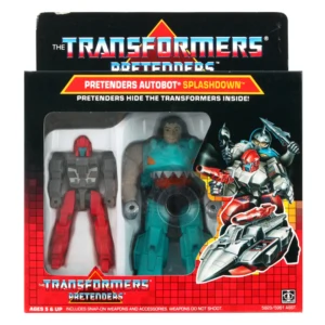 Splashdown transforms into an extraordinarily vague-looking Cybertronic hovercraft. In this mode, his small blaster pegs on the top of his shield, which completes the vehicle mode. His robot form fits inside his Pretender shell, which can also mount the shield on its left arm. Similarly to Sky High and Groundbreaker, the shell's chest plate features an animal-inspired design, in Splashdown's case, a shark's head.