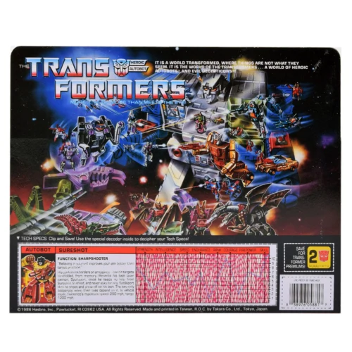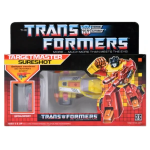 Sureshot transforms into a Cybertronic buggy somewhat resembling a Baja buggy. As a Targetmaster, he can hold in his hand or mount on his vehicle mode roof any Targetmaster gun (or any weapon that uses a 5mm peg). He came with his partner, Spoilsport/Spoil. Like the other Targetmasters, his Japanese release lacks a rubsign.