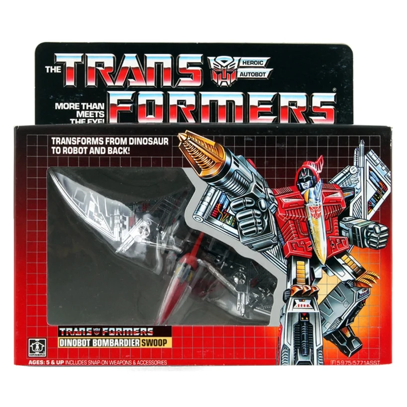 Swoop's toy transforms into a robotic Pteranodon. Swoop can stand on his beast feet or lie on his stomach in this mode, but additionally has fold-out wheels located in his feet and chest (though one has to split his chest open to access the latter wheel). His beak and tail were rounded for safety reasons compared to the original Diaclone release. However, the remolding of the tail kept the tail sticker from fitting correctly. Interestingly, despite being a former Diaclone toy, Swoop is the only Dinobot not to have an obvious cockpit for a Diaclone driver figure. Swoop's die-cast metal chest is painted red, which is his Transformers color, as opposed to his cartoon color scheme which was based on the Diaclone toy. Along with his sword, he also comes with two spring-loaded missile launchers, the only Dinobot to have two projectile-launchers (and no non-firing gun to boot.) Swoop is notable for being one of the most fragile Generation 1 toys, and as such commands a respectable amount of money on the secondary market due to the difficulty in finding one intact. In Japan, Swoop and the other Dinobots were offered as mail-away items during Operation Combination. Swoop cost 1800 yen (his original retail price, less than the other four) and two Robot Points.