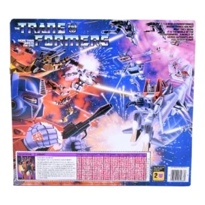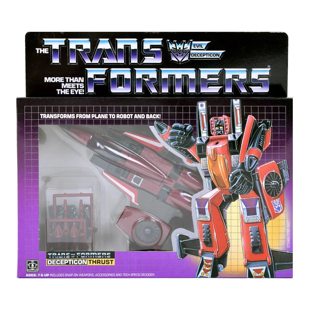 The Generation 1 Thrust toy is a retool of the original Starscream, who was originally a Diaclone "Jet Robo Acrobat-Type" F-15 Eagle. His central F-15 body is unchanged, but he has new wings with ducted VTOL fans, and new rear stabilizers. Unlike his 1985 mold-mates Dirge and Ramjet, Thrust retained the original launchers, null-ray lasers and cluster bomb projectiles used in Starscream, Thundercracker, and Skywarp. Thrust's robot mode stickers are the same design as Skywarp's, but in different colors. In robot mode his official instructions have the user pulling down his nose cone to complete his head transformation, like Starscream. However, Thrust's television incarnation (like Ramjet and Dirge) depicts him as having his head untransformed, giving a distinctive 'conehead' shape. This has led many owners to do the same thing, differentiating the three later Decepticon jets from the three earlier ones.