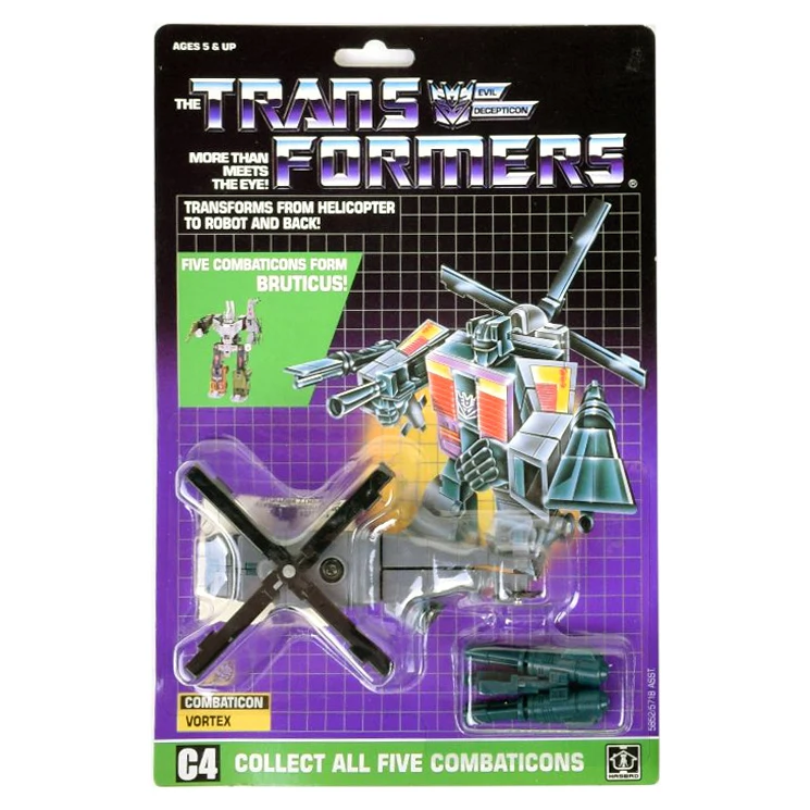 Vortex transforms into a Kaman SH-2 Seasprite helicopter. He is armed with a small, chin-mounted semi-automatic glue gun and two large, tri-barrel Gatling guns mounted astern on his tail. In robot mode, Vortex is armed with his helicopter chin gun, and along with fellow Combaticon Blast Off, is one of the first Transformers figures to utilize ball-joints, located in his shoulders. The top of his helicopter mode (where his rotor attaches) is capable of rotating as part of his transformation so that the rotor can be mounted 'forwards' in vehicle mode but high on his back in robot mode. Many pictures of Vortex (including the one to the right) neglect this step, leaving him mistransformed and awkward looking in his helicopter form. Vortex normally becomes the left arm of Bruticus, but as a Scramble City-style design, he can also occupy any other limb slot on Bruticus. There are a few variations of this toy. Initial releases of Vortex gave him a die-cast metal chestplate painted deep purple. Later releases replaced the metal with lighter-purple plastic. In 1991, the entire Combaticon team was re-released as part of the European "Classics" line; like many toys released in this series, Vortex was retooled to remove the rubsign indent from his vehicle mode. This mold was redecoed as Operation Combination Target Hawk, as well as 2001 Robots in Disguise and Universe Ro-Tor. Vortex's left side cannon was retooled into the Action Master Over-Run's "rotary photon pulse laser cannon", which appropriately can be attached to his helicopter.