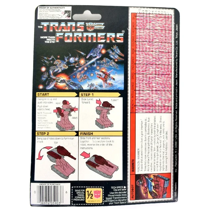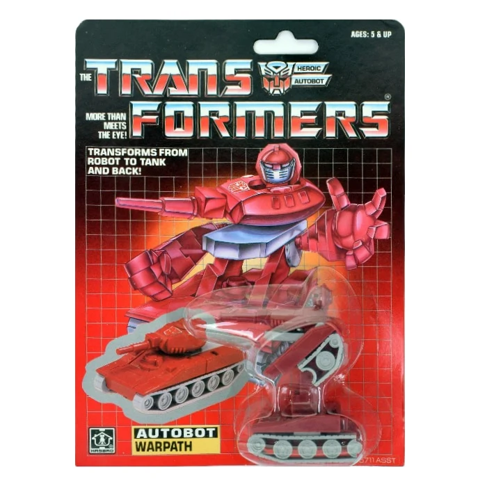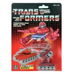 Warpath transforms into a General Motors M551A1 Sheridan ARAAV tank. There is a notable paint variation on Warpath: while most releases have black-painted optics, some leave the optics unpainted yet cover his entire faceplate in black. In 1986, he was made available as a mail-away item (as he was no longer shipping to retail shelves) in the Digital Doom on the Highway to Destruction flier packed with most boxed Transformers toys. He cost $4 and one Robot Point. In Japan, he was made available only as a mail-away item, costing 500 yen and two Robot Points.
