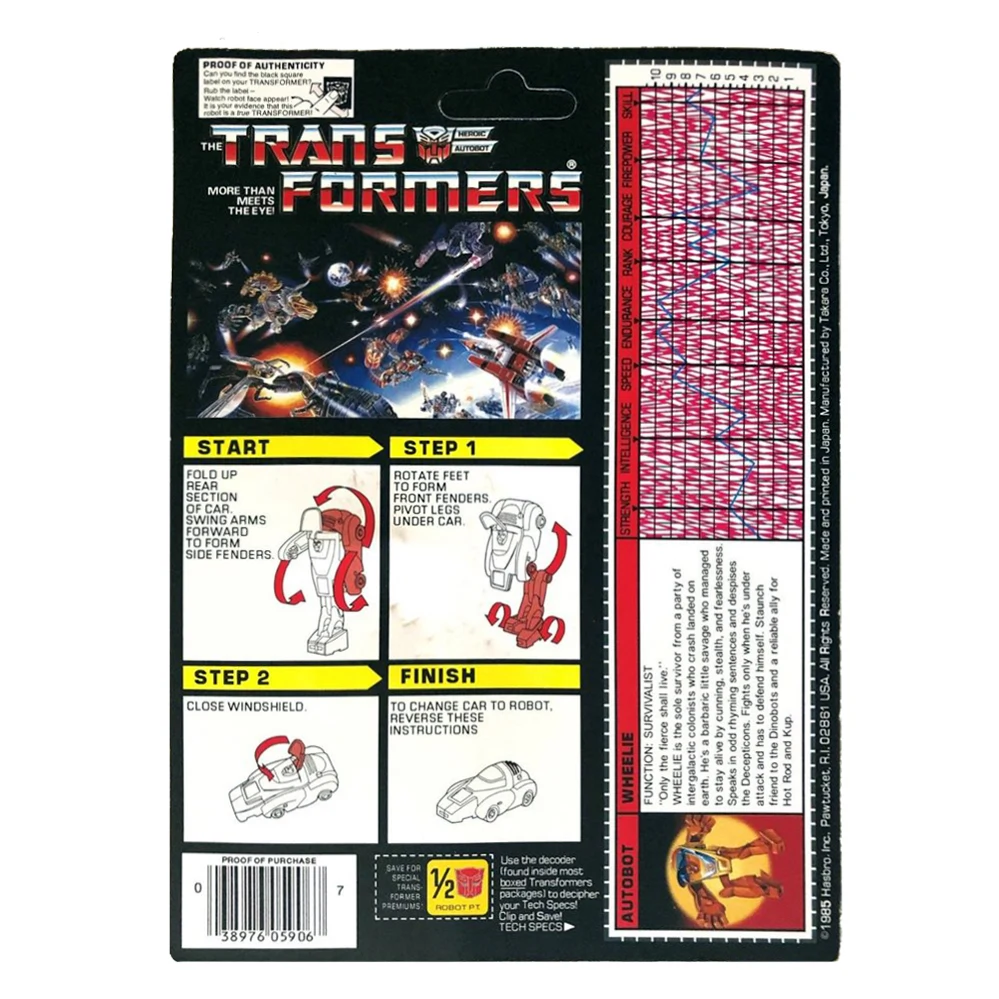 Wheelie's transformation does not go very far, he turns into a generic "futuristic car". Surprisingly enough, the fans' fancy he tickles, as he's the only new mold of the third-year Mini Vehicles. This mold was redecoed much later on, into an old friend of Prime's named Dion.