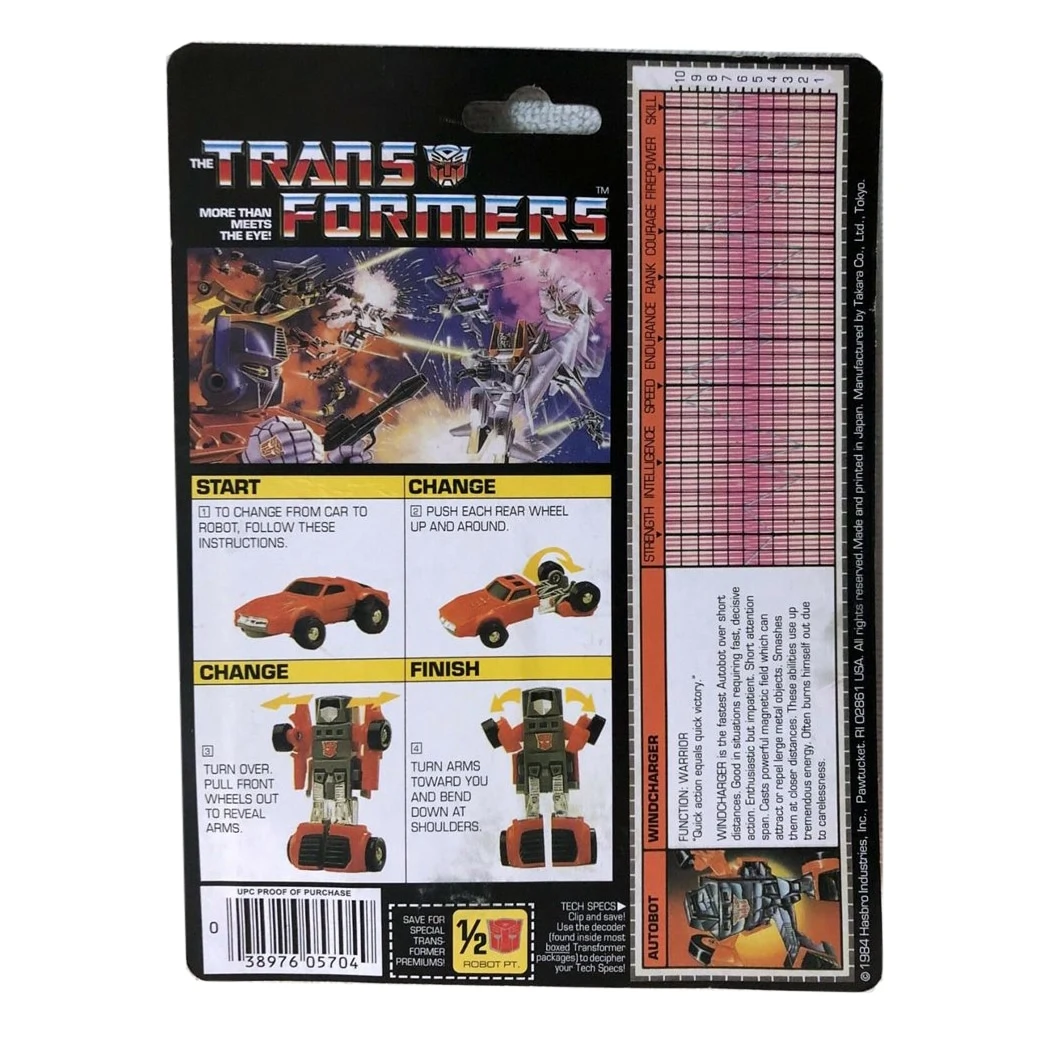 Released in the first year of Transformers in the same color as its Microchange version, and later on in a darker shade of red (coinciding with the addition of the rub mark to the line in 1985), Windcharger transforms into a Pontiac Firebird Trans Am sports car. The Microchange toyline was meant to depict robots that turn into toy cars, which accounts for the somewhat cartoonish proportions of Windcharger's Trans Am mode. This mold was also used to make Camaro (which was repurposed as Shattered Glass Windcharger), and was retooled to make Tailgate.