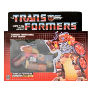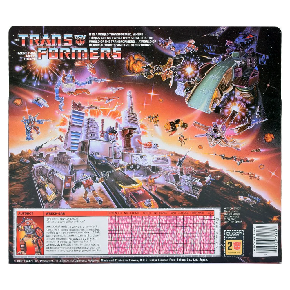 Wreck-Gar's first (and for decades, only) toy transforms into a Cybertronic "junk" motorcycle, and is noteworthy for being one of the earliest uses of ball-and-socket joints in The Transformers toyline. As his fists become the axle for his front wheel, his two weapons can be mounted there in motorcycle mode. Unfortunately, two Wreck-Gar toys are completely incapable of riding one another, unlike the action depicted in the movie.