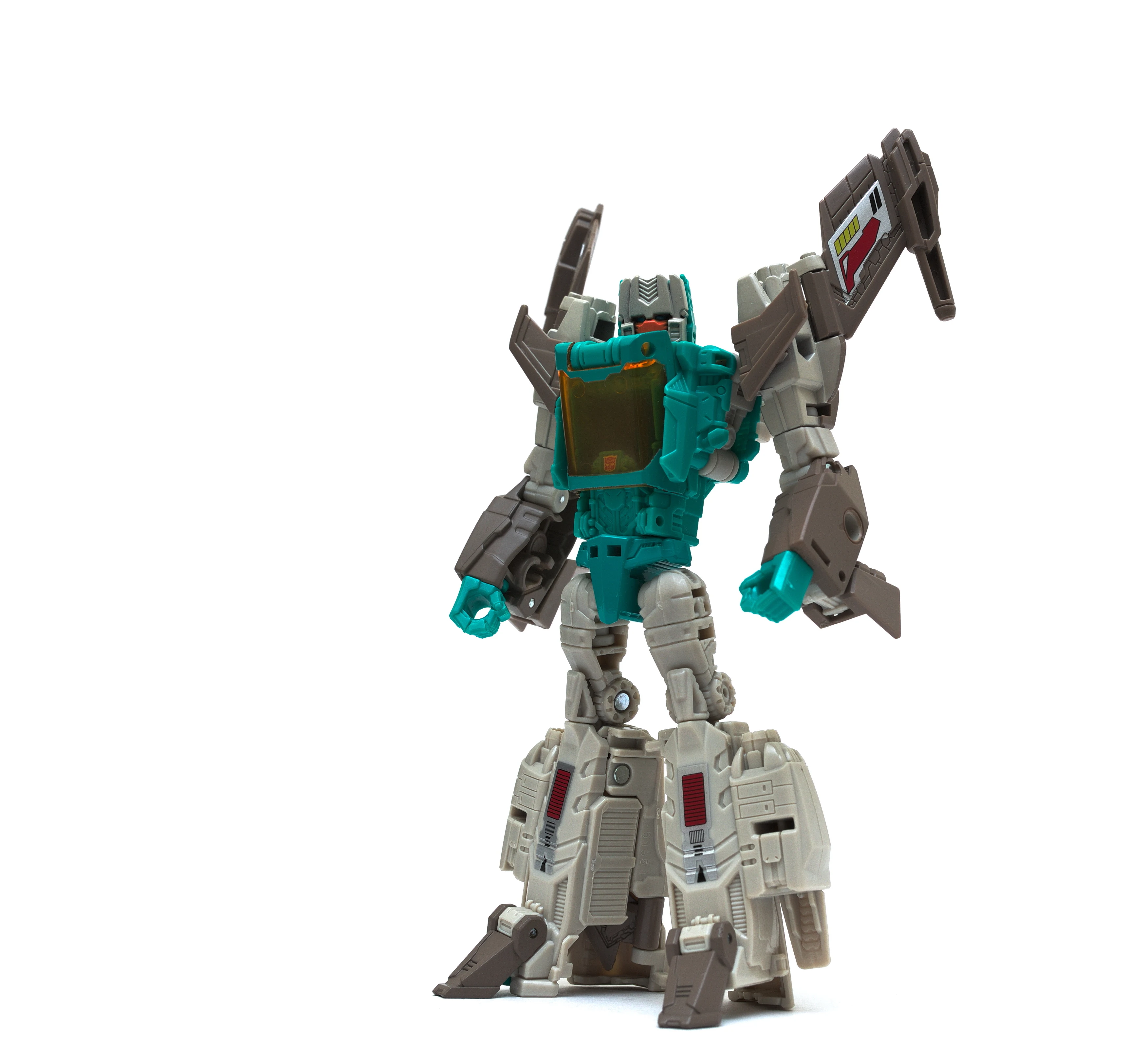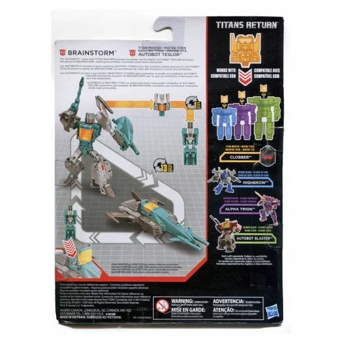 A differently-decoed Brainstorm was also sold individually. Compared to the San Diego Comic-Con version, this one has a deco closer to the original G1 toy, including a yellow canopy. Although it has fewer paint apps than the Titan Force giftset version, it features more tampographed details instead. As with most Titans Return figures, Brainstorm also comes with a collectors' card based on his packaging art. Initial samples on display at conventions had his helmet left unpainted (showing the same darker gray as used on his wings and feet) and his Autobot symbol tampograph applied to the top of his canopy like on his Titan Force release. His stock photography, however, matches the version of the figure available at retail. In the United States, Brainstorm was available as the first ever exclusive to Walgreens drug stores. However, in late August 2016, before Brainstorm became widely available at Walgreens, a single case was discovered at a Walmart store in the United States, which ended up being an isolated incident. In Hasbro's Asian markets, meanwhile, Brainstorm was available at general retail in a case all by himself, and ended up as a massive shelfwarmer at stores such as Toys"R"Us and AEON. The packaging features the assortment number for the general retail Titans Return Deluxe Class, implying that the decision to make him an exclusive was a late one.